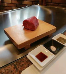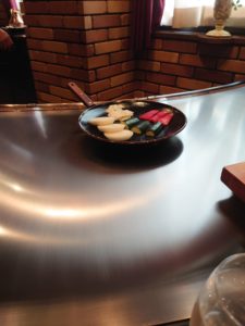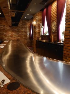 店内はレンガ調でシックな趣。昭和な感じの豪華版(何と言ってもビフテキですから)でRの天然赤御影石のカウンターに磨き抜かれた鉄板がまぶしいです。鉄板焼きの職人さんはとても朗らかに、3人の会話が弾む中タイミングよく説明を交えて、美しくお料理を焼いてくださいました。
