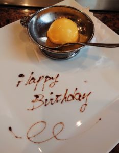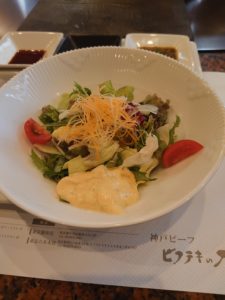 ガーリックも時々いただきながら、淡路島産の玉ねぎも甘く、完食。マヨネーズベースのドレッシングのサラダもシンプル、デザートはBirthdayプレートも美しい文字体でサプライズで書いていただき(名前も入れていただきました。)