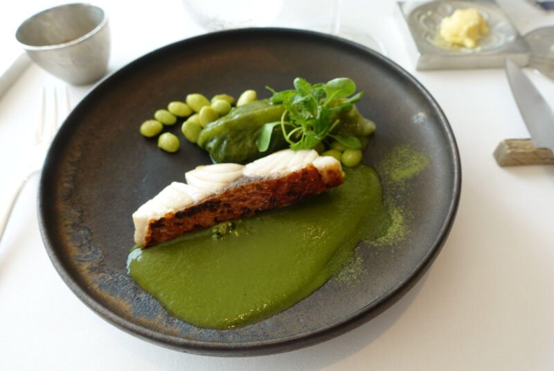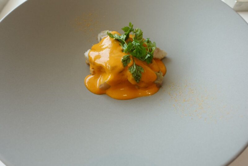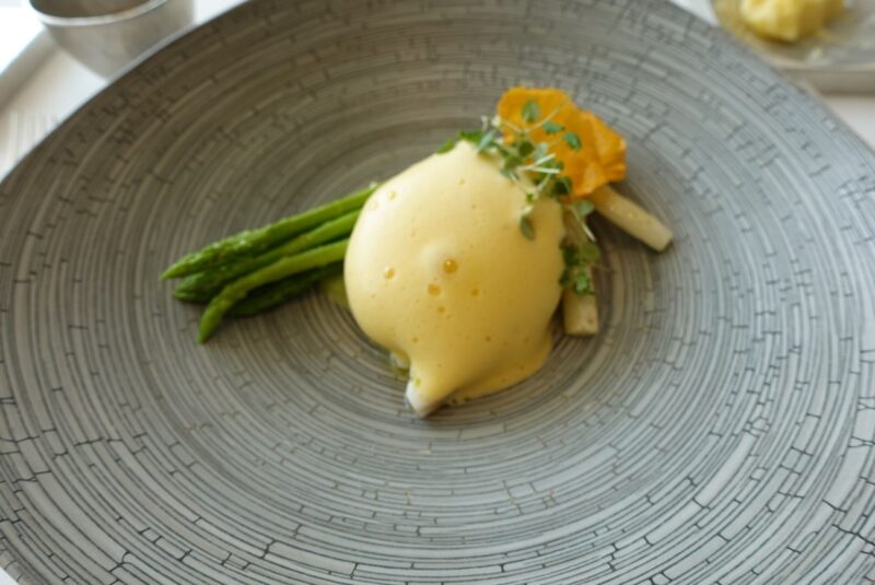 ・蒸した鱸とグリーンアスパラガス 茸とアスパラガスのソース