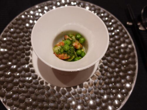 クルマエビのおいしさはもちろんのこと、季節のグリーンピースや、山椒効いたネギのソースが絶妙です。