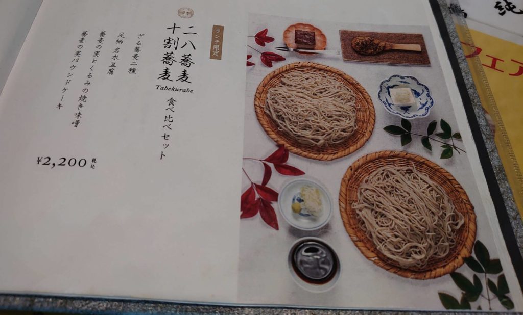 でランチ。十割そばが好きなので写真メニューの食べ比べセットが食べたかったのですが、残念なことに平日限定だそうで、つけとろろ(とろろの入った自家製つゆのざるそば)¥1,404税込と富士と龍のラベルにひかれ、箱根の地酒、神龍180ml¥864税込を、さっといただきました。入口はガラス張りで蕎麦打ち名人の打ち姿を見ることが出来ます。店内は箱根の寄せ木細工で飾られ、広い店内ではありませんが窓側だと夜は夜景が臨めます。