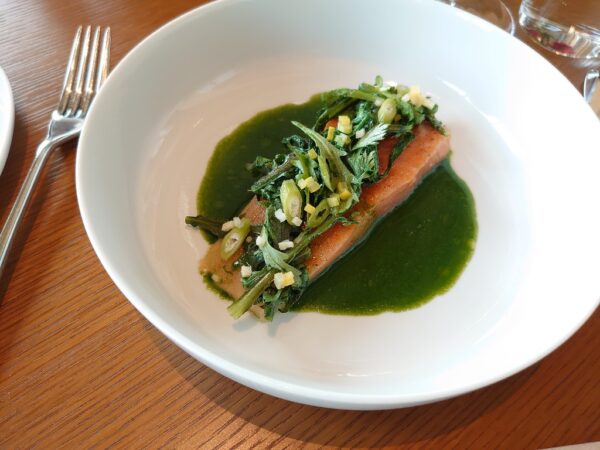 北海道産サクラマスは春菊ソースで、春菊の苦みはなく、桜鱒はとても脂がのりすぎ位
