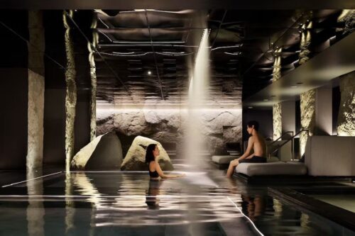 水音が心地よく響く、暗めの照明の静かな空間の中、地下の天然温泉のほどよい