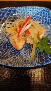 柔らか鮭の上にかかった糸瓜がコリコリで、万願寺唐辛子の甘さと茸南蛮、パプリカと野菜ソースはやばりプロの技で、鮭ととても相性の良いソースとなっていました。