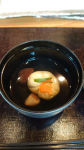 真丈の出汁はいつもホッとする澄んだ美味しさで、真丈はホワホワで本日は新銀杏でした。柚子にスティックが香り良く、人参、山伏茸がアクセントでした。