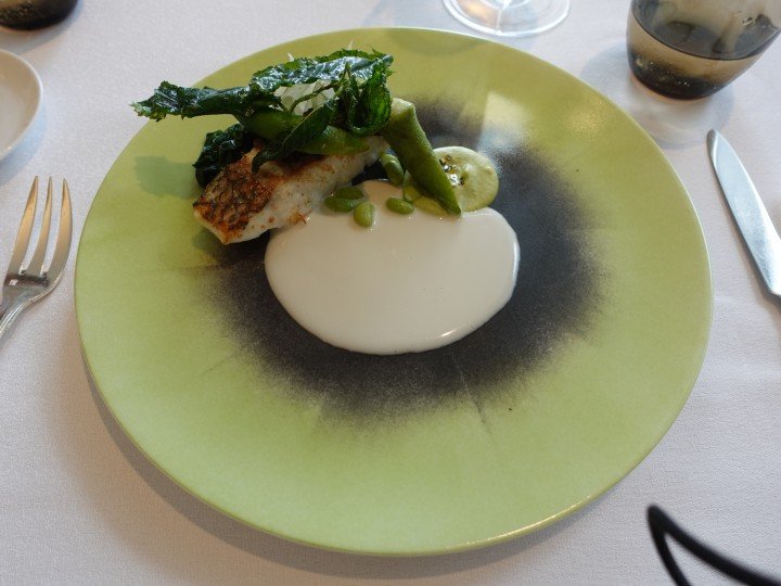 Blanc de Bar légèrement cuit au fourAccompagné de “Zunda” et d’une Sauce Croquante au Champagne