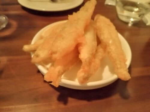ズッキーニとワカサギのフリットはサクサク薄衣は程よい塩分で熱々