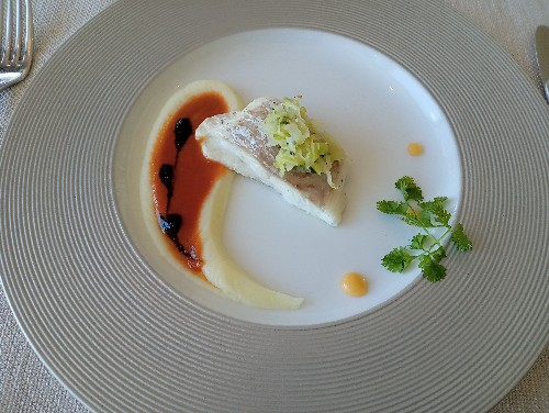 白ワイン蒸しの柔らか真鯛。ちりめんキャベツ、シブレットのバター添え
