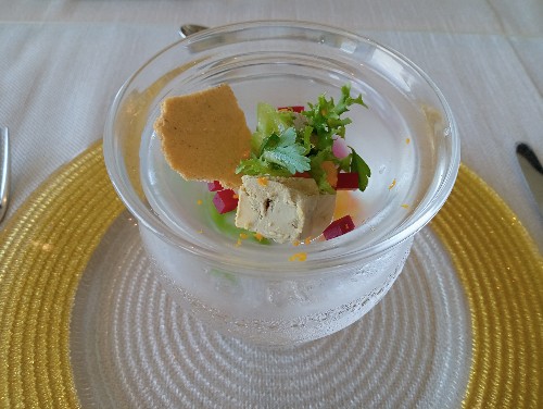 ピューレ状の栗の上に栗甘露煮、フォアグラテリーヌ、オレンジ、ビーツ、ピクルス