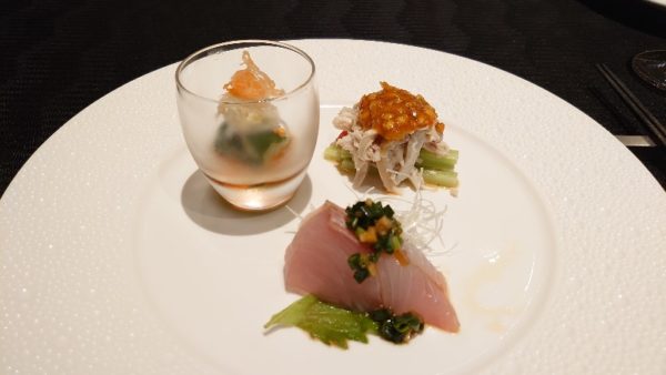 老油が効いたキュウリの甘酢、棒棒鶏、かんぱち中華風