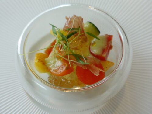 太刀魚と野菜のマリネとスマックの香り 甘酒と肉のソース