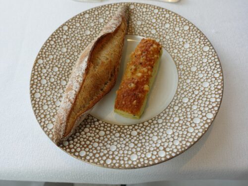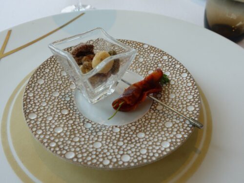 茄子のピュレとパートブリックで巻いたスペイン産アンチョビーを添えて