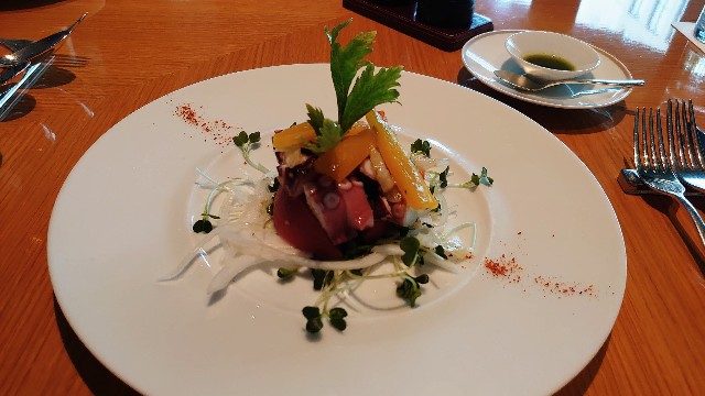 タコとセロリのイタリアン風サラダ たくさんの身の締まったタコが入っていてセロリスライスが敷き詰められています。バジルソースはお好みで