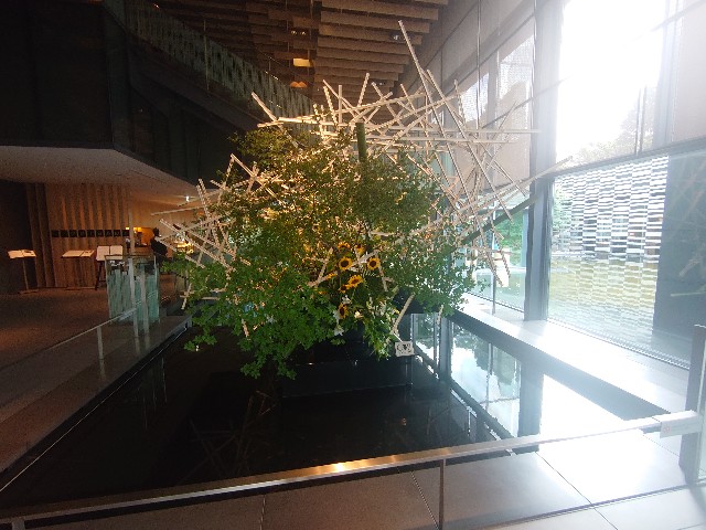 ORIGAMI正面には季節ごとに草月流の巨大生花がお出迎えです。8月といえば、ひまわりですね🌻